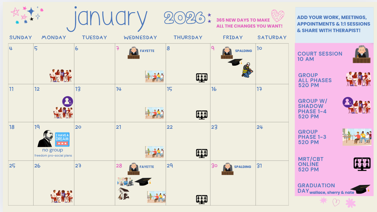 All Treatment Groups begin at 5:20 pm. Your 1:1 sessions are scheduled according to your therapist availability. It is YOUR responsibility to get on their schedule for your required amount of sessions. All sessions & groups are considered court-ordered appearances so timeliness and attendance are not optional. Group nights are always Monday, Wednesday and Thursday.